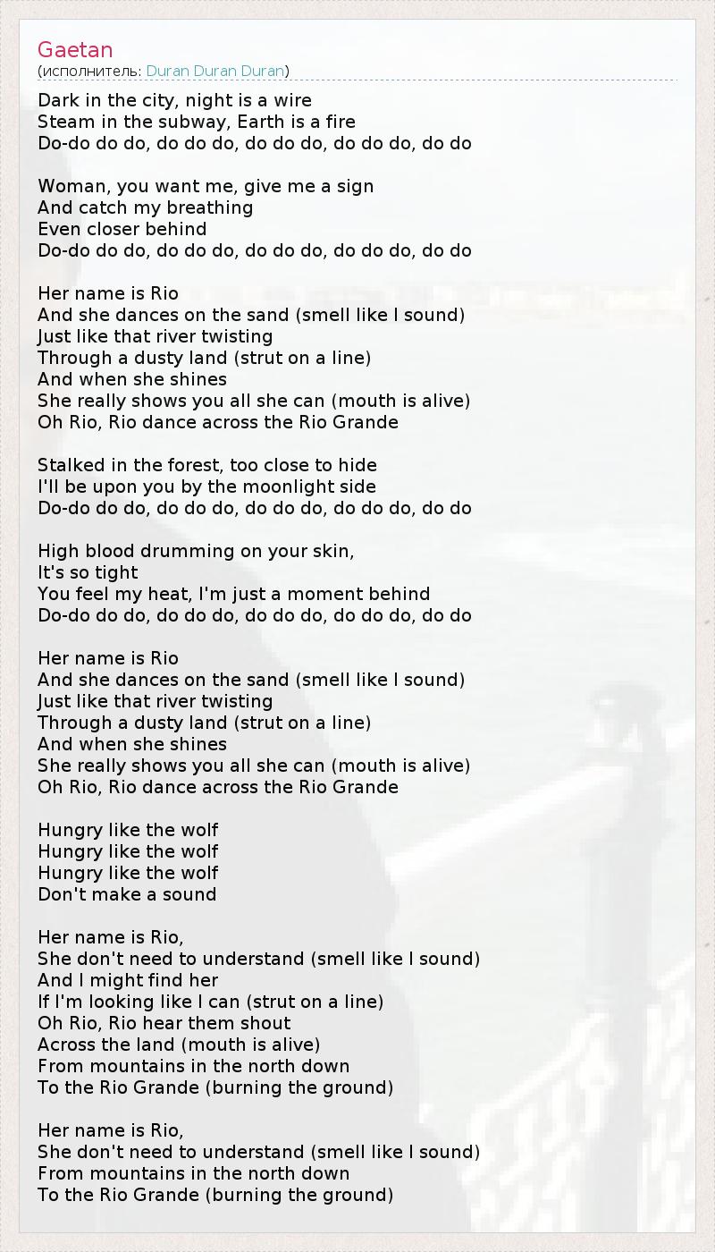 Dark in the city, night is a wire Steam in the subway, Earth is a fire Do-do do do, do do do, do do do, do do do, do do Woman, you want me, give me a sign And catch my breathing Even closer behind Do-do do do, do do do, do do do, do do do, do do Her name is Rio And she dances on the sand (smell like I sound) Just like that river twisting Through a dusty land (strut on a line) And when she shines She really shows you all she can (mouth is alive) Oh Rio, Rio dance across the Rio Grande Stalked in the forest, too close to hide I'll be upon you by the moonlight side Do-do do do, do do do, do do do, do do do, do do High blood drumming on your skin, It's so tight You feel my heat, I'm just a moment behind Do-do do do, do do do, do do do, do do do, do do Her name is Rio And she dances on the sand (smell like I sound) Just like that river twisting Through a dusty land (strut on a line) And when she shines She really shows you all she can (mouth is alive) Oh Rio, Rio dance across the Rio Grande Hungry like the wolf Hungry like the wolf Hungry like the wolf Don't make a sound Her name is Rio, She don't need to understand (smell like I sound) And I might find her If I'm looking like I can (strut on a line) Oh Rio, Rio hear them shout Across the land (mouth is alive) From mountains in the north down To the Rio Grande (burning the ground) Her name is Rio, She don't need to understand (smell like I sound) From mountains in the north down To the Rio Grande (burning the ground)