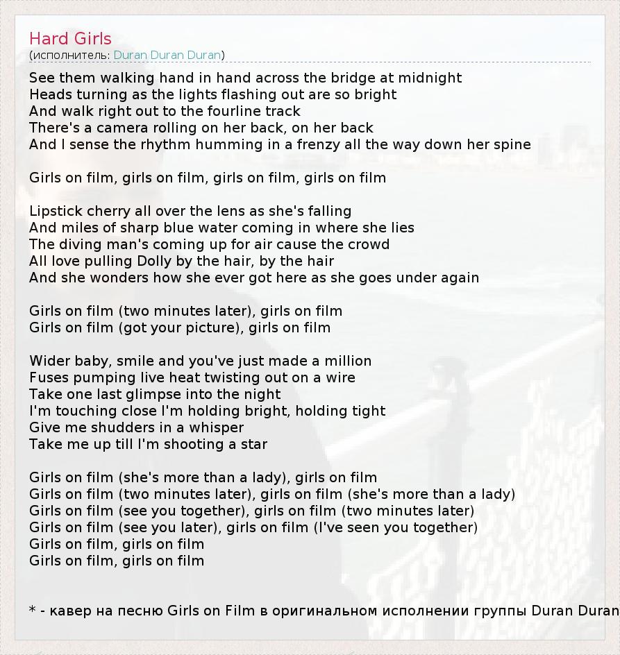 See them walking hand in hand across the bridge at midnight Heads turning as the lights flashing out are so bright And walk right out to the fourline track There's a camera rolling on her back, on her back And I sense the rhythm humming in a frenzy all the way down her spine Girls on film, girls on film, girls on film, girls on film Lipstick cherry all over the lens as she's falling And miles of sharp blue water coming in where she lies The diving man's coming up for air cause the crowd All love pulling Dolly by the hair, by the hair And she wonders how she ever got here as she goes under again Girls on film (two minutes later), girls on film Girls on film (got your picture), girls on film Wider baby, smile and you've just made a million Fuses pumping live heat twisting out on a wire Take one last glimpse into the night I'm touching close I'm holding bright, holding tight Give me shudders in a whisper Take me up till I'm shooting a star Girls on film (she's more than a lady), girls on film Girls on film (two minutes later), girls on film (she's more than a lady) Girls on film (see you together), girls on film (two minutes later) Girls on film (see you later), girls on film (I've seen you together) Girls on film, girls on film Girls on film, girls on film * - кавер на песню Girls on Film в оригинальном исполнении группы Duran Duran