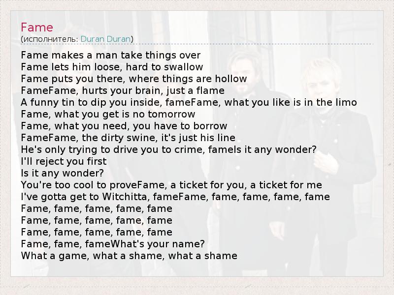 You're too cool to proveFame, a ticket for you, a ticket for me