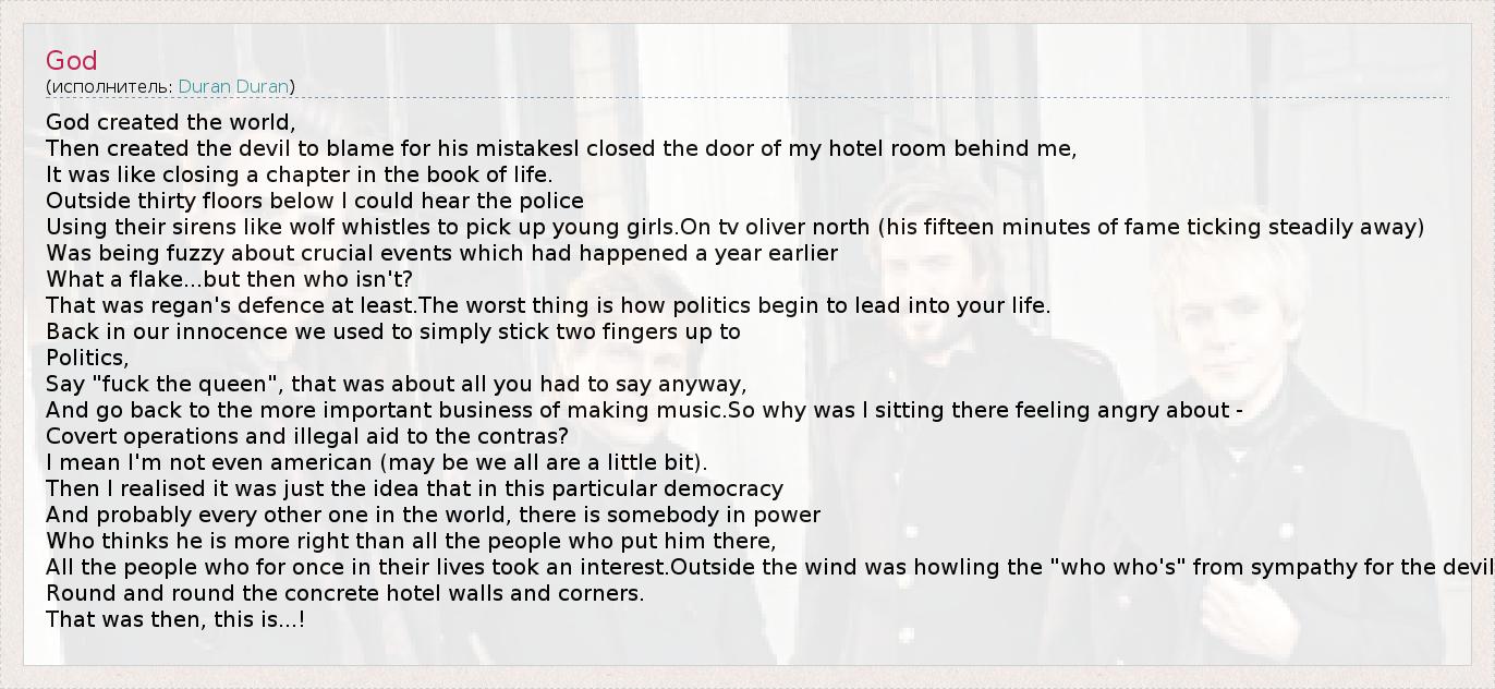 Это интересно:Группа образовалась в 1978 году в городе Бирмингем (Великобритания). В состав коллектива, взявшего название одного из персонажей культового фантастического фильма 60-х “Barbarella”, вошли вокалист Саймон Ле Бон (27.10.1958), клавишник Ник Роудс (08.06.1962), гитарист Энди Тейлор (16.02.1961), басист Джон Тейлор (20.06.1960) и барабанщик Роджер Тейлор (26.04.1960). Первыми менеджерами группы стали Майкл и Пол Берроу, владельцы... продолжение