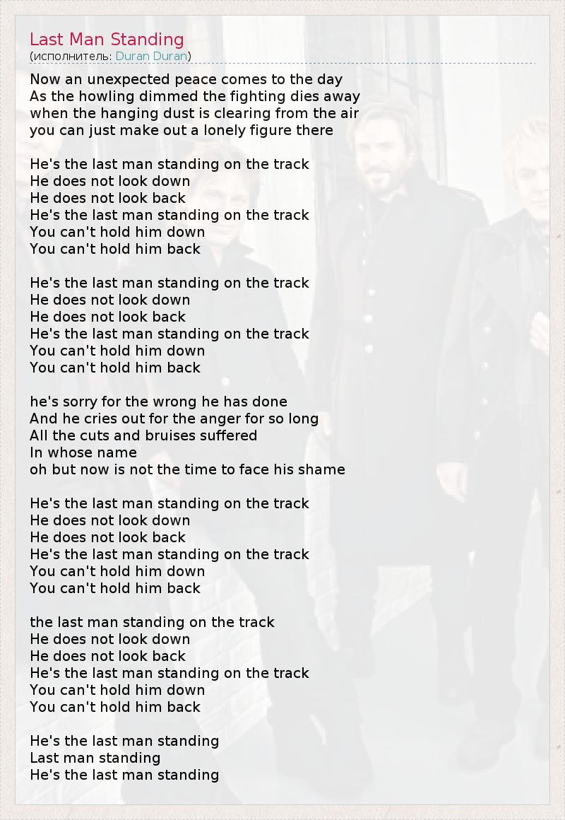 Now an unexpected peace comes to the day As the howling dimmed the fighting dies away when the hanging dust is clearing from the air you can just make out a lonely figure there He's the last man standing on the track He does not look down He does not look back He's the last man standing on the track You can't hold him down You can't hold him back He's the last man standing on the track He does not look down He does not look back He's the last man standing on the track You can't hold him down You can't hold him back he's sorry for the wrong he has done And he cries out for the anger for so long All the cuts and bruises suffered In whose name oh but now is not the time to face his shame He's the last man standing on the track He does not look down He does not look back He's the last man standing on the track You can't hold him down You can't hold him back the last man standing on the track He does not look down He does not look back He's the last man standing on the track You can't hold him down You can't hold him back He's the last man standing Last man standing He's the last man standing
