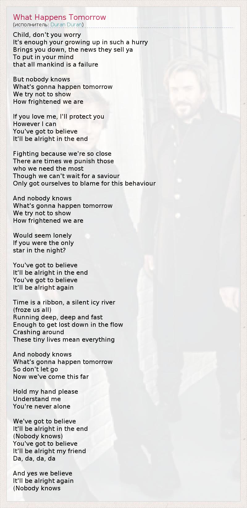 А как ты думаешь, о чем песня "What Happens Tomorrow" ?