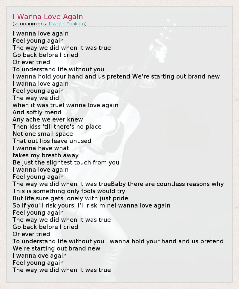 I wanna love again Feel young again The way we did when it was true Go back before I cried Or ever tried To understand life without you I wanna hold your hand and us pretend We're starting out brand new I wanna love again Feel young again The way we did when it was trueI wanna love again And softly mend Any ache we ever knew Then kiss 'till there's no place Not one small space That out lips leave unused I wanna have what takes my breath away Be just the slightest touch from you I wanna love again Feel young again The way we did when it was trueBaby there are countless reasons why This is something only fools would try But life sure gets lonely with just pride So if you'll risk yours, I'll risk mineI wanna love again Feel young again The way we did when it was true Go back before I cried Or ever tried To understand life without you I wanna hold your hand and us pretend We're starting out brand new I wanna ove again Feel young again The way we did when it was true