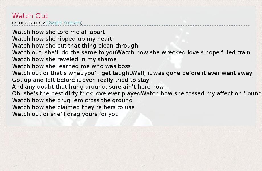 Watch out, she'll do the same to youWatch how she wrecked love's hope filled train