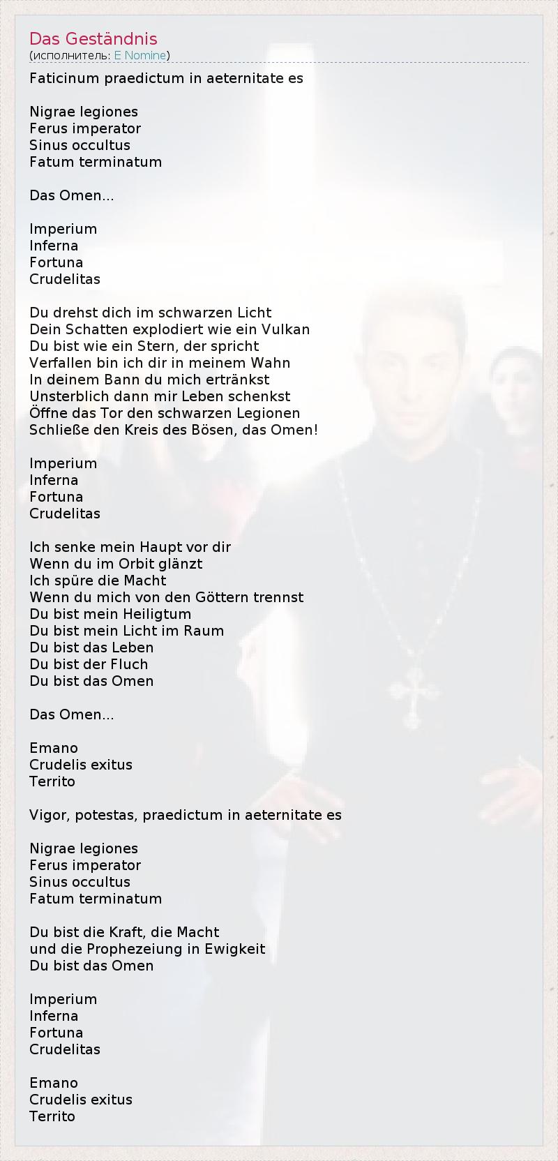 13) Ты сила, мощь и пророчество во веки веков (лат.). Строчка присутствует только в Extended Mix композиции с сингла Das Omen (второй трек).