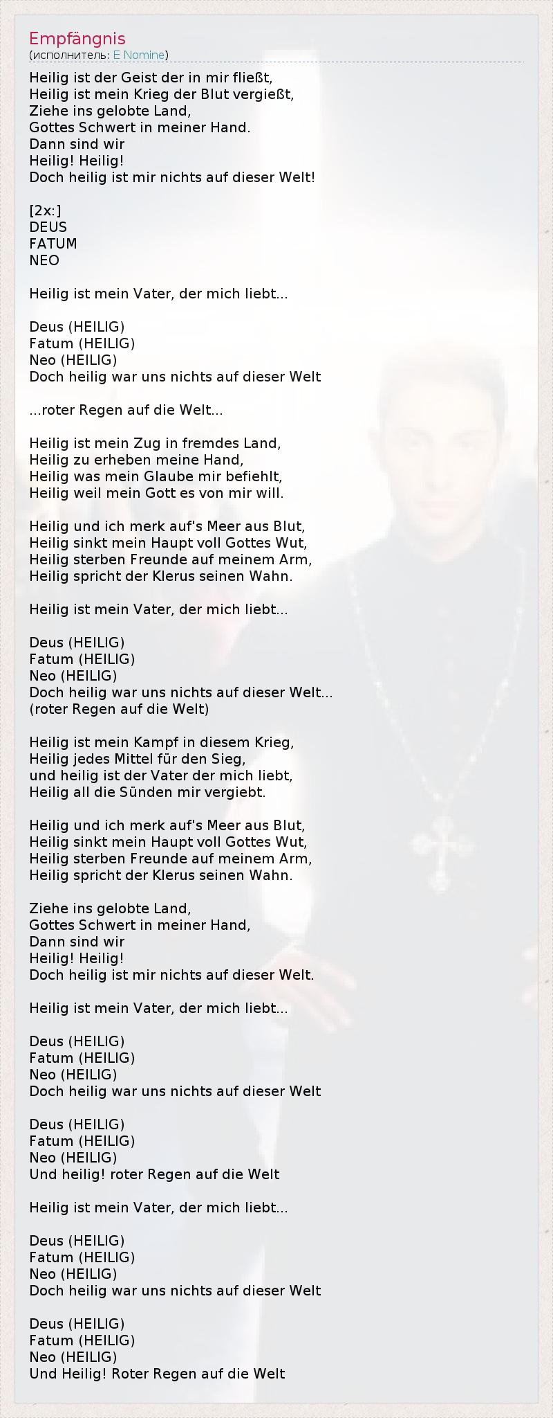 Это интересно:Когда первый хит E Nomine «Vater Unser» штурмовал немецкие чарты, критики гадали: E Nomine — это что? Гениальная ли артистическая концепция или эпатажный кич, хорошо ли замаскированная попса или готический транс. В итоге к проекту пристал ярлык Monumental Dance. Сходились все в одном — E Nomine суждено было быть однодневкой. И все, казалось, к этому шло. После альбома Das Testament, принесшего команде культовый статус... продолжение