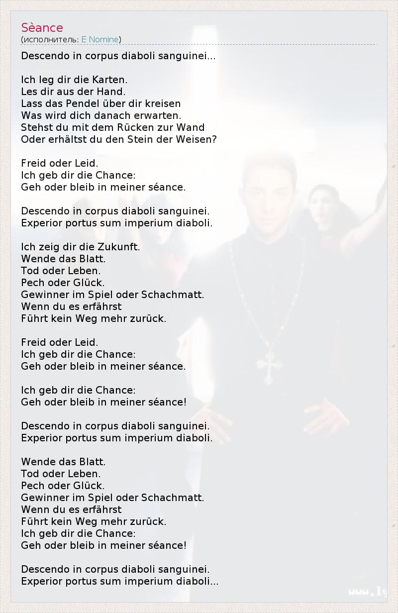 Descendo in corpus diaboli sanguinei... Ich leg dir die Karten. Les dir aus der Hand. Lass das Pendel über dir kreisen Was wird dich danach erwarten. Stehst du mit dem Rücken zur Wand Oder erhältst du den Stein der Weisen? Freid oder Leid. Ich geb dir die Chance: Geh oder bleib in meiner séance. Descendo in corpus diaboli sanguinei. Experior portus sum imperium diaboli. Ich zeig dir die Zukunft. Wende das Blatt. Tod oder Leben. Pech oder Glück. Gewinner im Spiel oder Schachmatt. Wenn du es erfährst Führt kein Weg mehr zurück. Freid oder Leid. Ich geb dir die Chance: Geh oder bleib in meiner séance. Ich geb dir die Chance: Geh oder bleib in meiner séance! Descendo in corpus diaboli sanguinei. Experior portus sum imperium diaboli. Wende das Blatt. Tod oder Leben. Pech oder Glück. Gewinner im Spiel oder Schachmatt. Wenn du es erfährst Führt kein Weg mehr zurück. Ich geb dir die Chance: Geh oder bleib in meiner séance! Descendo in corpus diaboli sanguinei. Experior portus sum imperium diaboli...