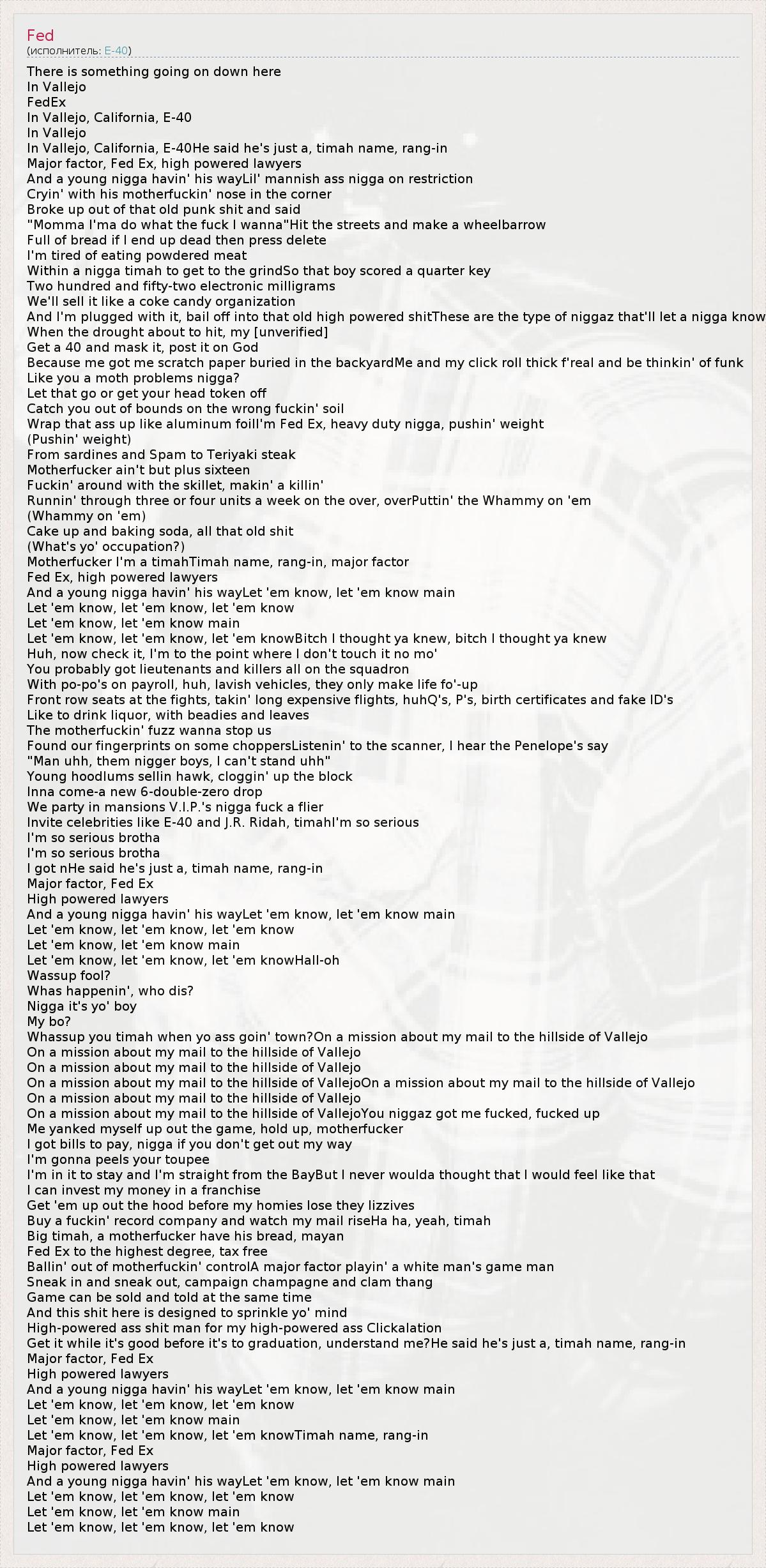 There is something going on down here In Vallejo FedEx In Vallejo, California, E-40 In Vallejo In Vallejo, California, E-40He said he's just a, timah name, rang-in Major factor, Fed Ex, high powered lawyers And a young nigga havin' his wayLil' mannish ass nigga on restriction Cryin' with his motherfuckin' nose in the corner Broke up out of that old punk shit and said "Momma I'ma do what the fuck I wanna"Hit the streets and make a wheelbarrow Full of bread if I end up dead then press delete I'm tired of eating powdered meat Within a nigga timah to get to the grindSo that boy scored a quarter key Two hundred and fifty-two electronic milligrams We'll sell it like a coke candy organization And I'm plugged with it, bail off into that old high powered shitThese are the type of niggaz that'll let a nigga know When the drought about to hit, my [unverified] Get a 40 and mask it, post it on God Because me got me scratch paper buried in the backyardMe and my click roll thick f'real and be thinkin' of funk Like you a moth problems nigga? Let that go or get your head token off Catch you out of bounds on the wrong fuckin' soil Wrap that ass up like aluminum foilI'm Fed Ex, heavy duty nigga, pushin' weight (Pushin' weight) From sardines and Spam to Teriyaki steak Motherfucker ain't but plus sixteen Fuckin' around with the skillet, makin' a killin' Runnin' through three or four units a week on the over, overPuttin' the Whammy on 'em (Whammy on 'em) Cake up and baking soda, all that old shit (What's yo' occupation?) Motherfucker I'm a timahTimah name, rang-in, major factor Fed Ex, high powered lawyers And a young nigga havin' his wayLet 'em know, let 'em know main Let 'em know, let 'em know, let 'em know Let 'em know, let 'em know main Let 'em know, let 'em know, let 'em knowBitch I thought ya knew, bitch I thought ya knew Huh, now check it, I'm to the point where I don't touch it no mo' You probably got lieutenants and killers all on the squadron With po-po's on payroll, huh, lavish vehicles, they only make life fo'-up Front row seats at the fights, takin' long expensive flights, huhQ's, P's, birth certificates and fake ID's Like to drink liquor, with beadies and leaves The motherfuckin' fuzz wanna stop us Found our fingerprints on some choppersListenin' to the scanner, I hear the Penelope's say "Man uhh, them nigger boys, I can't stand uhh" Young hoodlums sellin hawk, cloggin' up the block Inna come-a new 6-double-zero drop We party in mansions V.I.P.'s nigga fuck a flier Invite celebrities like E-40 and J.R. Ridah, timahI'm so serious I'm so serious brotha I'm so serious brotha I got nHe said he's just a, timah name, rang-in Major factor, Fed Ex High powered lawyers And a young nigga havin' his wayLet 'em know, let 'em know main Let 'em know, let 'em know, let 'em know Let 'em know, let 'em know main Let 'em know, let 'em know, let 'em knowHall-oh Wassup fool? Whas happenin', who dis? Nigga it's yo' boy My bo? Whassup you timah when yo ass goin' town?On a mission about my mail to the hillside of Vallejo On a mission about my mail to the hillside of Vallejo On a mission about my mail to the hillside of Vallejo On a mission about my mail to the hillside of VallejoOn a mission about my mail to the hillside of Vallejo On a mission about my mail to the hillside of Vallejo On a mission about my mail to the hillside of VallejoYou niggaz got me fucked, fucked up Me yanked myself up out the game, hold up, motherfucker I got bills to pay, nigga if you don't get out my way I'm gonna peels your toupee I'm in it to stay and I'm straight from the BayBut I never woulda thought that I would feel like that I can invest my money in a franchise Get 'em up out the hood before my homies lose they lizzives Buy a fuckin' record company and watch my mail riseHa ha, yeah, timah Big timah, a motherfucker have his bread, mayan Fed Ex to the highest degree, tax free Ballin' out of motherfuckin' controlA major factor playin' a white man's game man Sneak in and sneak out, campaign champagne and clam thang Game can be sold and told at the same time And this shit here is designed to sprinkle yo' mind High-powered ass shit man for my high-powered ass Clickalation Get it while it's good before it's to graduation, understand me?He said he's just a, timah name, rang-in Major factor, Fed Ex High powered lawyers And a young nigga havin' his wayLet 'em know, let 'em know main Let 'em know, let 'em know, let 'em know Let 'em know, let 'em know main Let 'em know, let 'em know, let 'em knowTimah name, rang-in Major factor, Fed Ex High powered lawyers And a young nigga havin' his wayLet 'em know, let 'em know main Let 'em know, let 'em know, let 'em know Let 'em know, let 'em know main Let 'em know, let 'em know, let 'em know