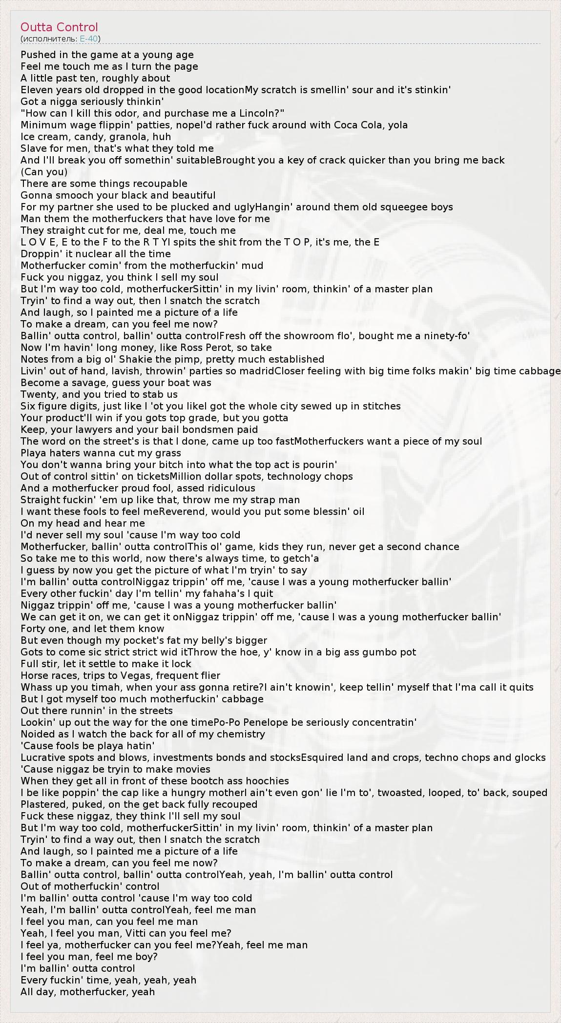 Это интересно:В 90-ых годах E-40 был одним из лидеров района Калифорнийского залива. Странная постановка рифм и использование большого количества сленга - вот что отличало его от всех остальных в районе Калифорнийского залива. Кроме того, его долговечность и искренность помогли ему заручиться хорошими отношениями со многими рэпперами, сначала с местными рэпперами из района залива, после с рэпперами... продолжение