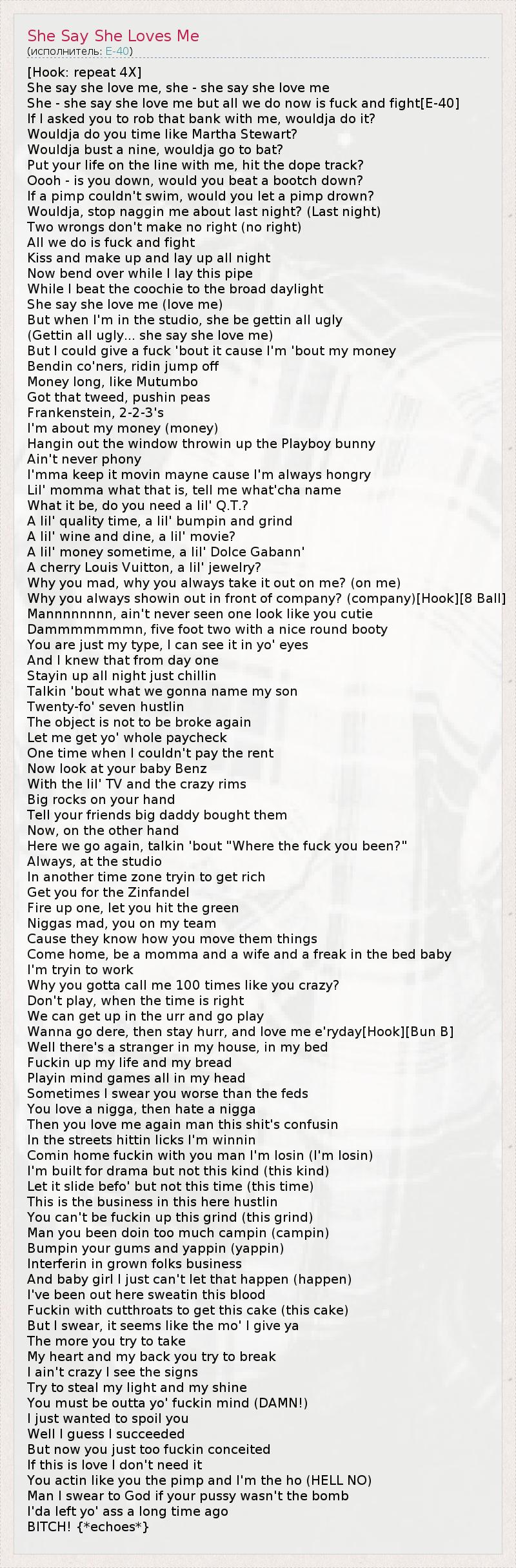 She - she say she love me but all we do now is fuck and fight[E-40]