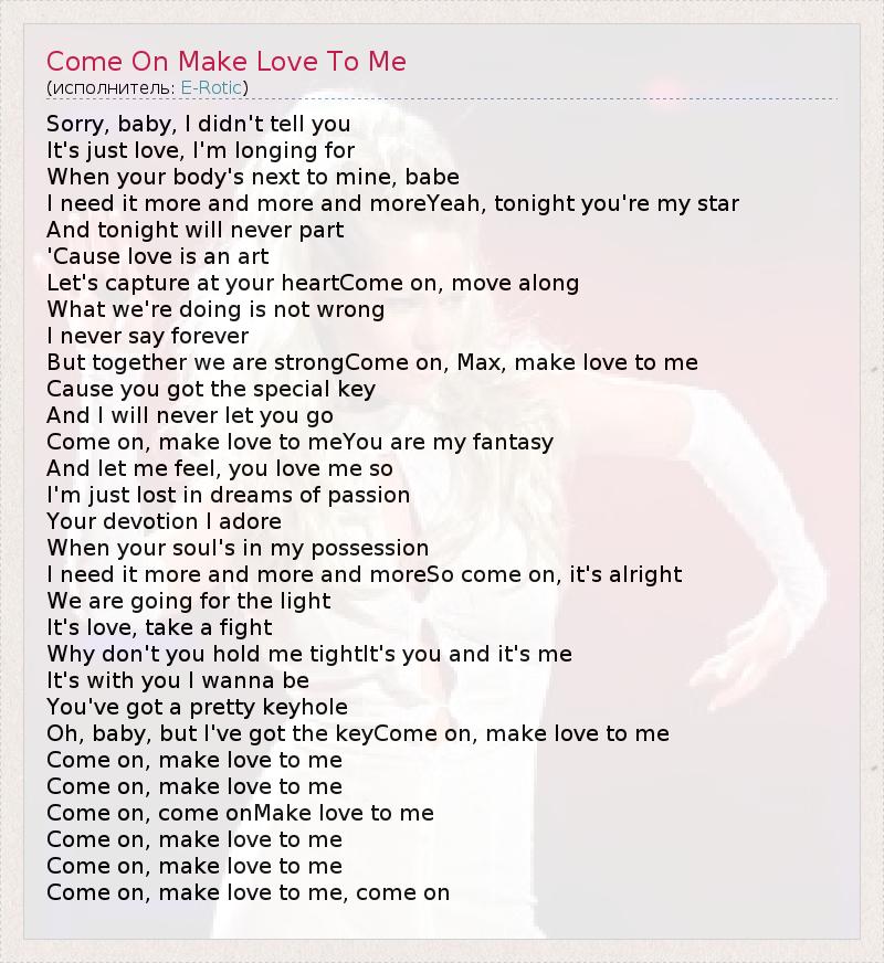 Sorry, baby, I didn't tell you It's just love, I'm longing for When your body's next to mine, babe I need it more and more and moreYeah, tonight you're my star And tonight will never part 'Cause love is an art Let's capture at your heartCome on, move along What we're doing is not wrong I never say forever But together we are strongCome on, Max, make love to me Cause you got the special key And I will never let you go Come on, make love to meYou are my fantasy And let me feel, you love me so I'm just lost in dreams of passion Your devotion I adore When your soul's in my possession I need it more and more and moreSo come on, it's alright We are going for the light It's love, take a fight Why don't you hold me tightIt's you and it's me It's with you I wanna be You've got a pretty keyhole Oh, baby, but I've got the keyCome on, make love to me Come on, make love to me Come on, make love to me Come on, come onMake love to me Come on, make love to me Come on, make love to me Come on, make love to me, come on