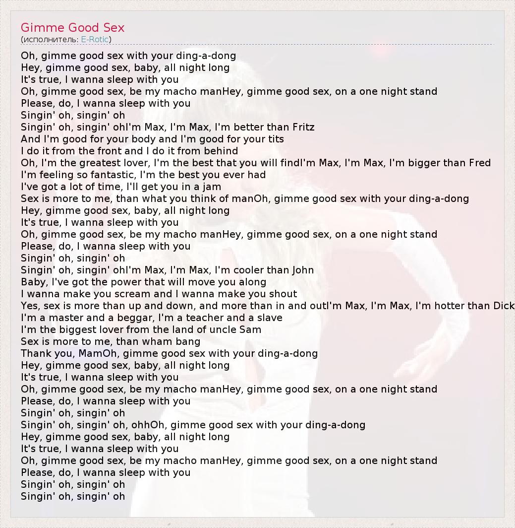 Oh, gimme good sex, be my macho manHey, gimme good sex, on a one night stand