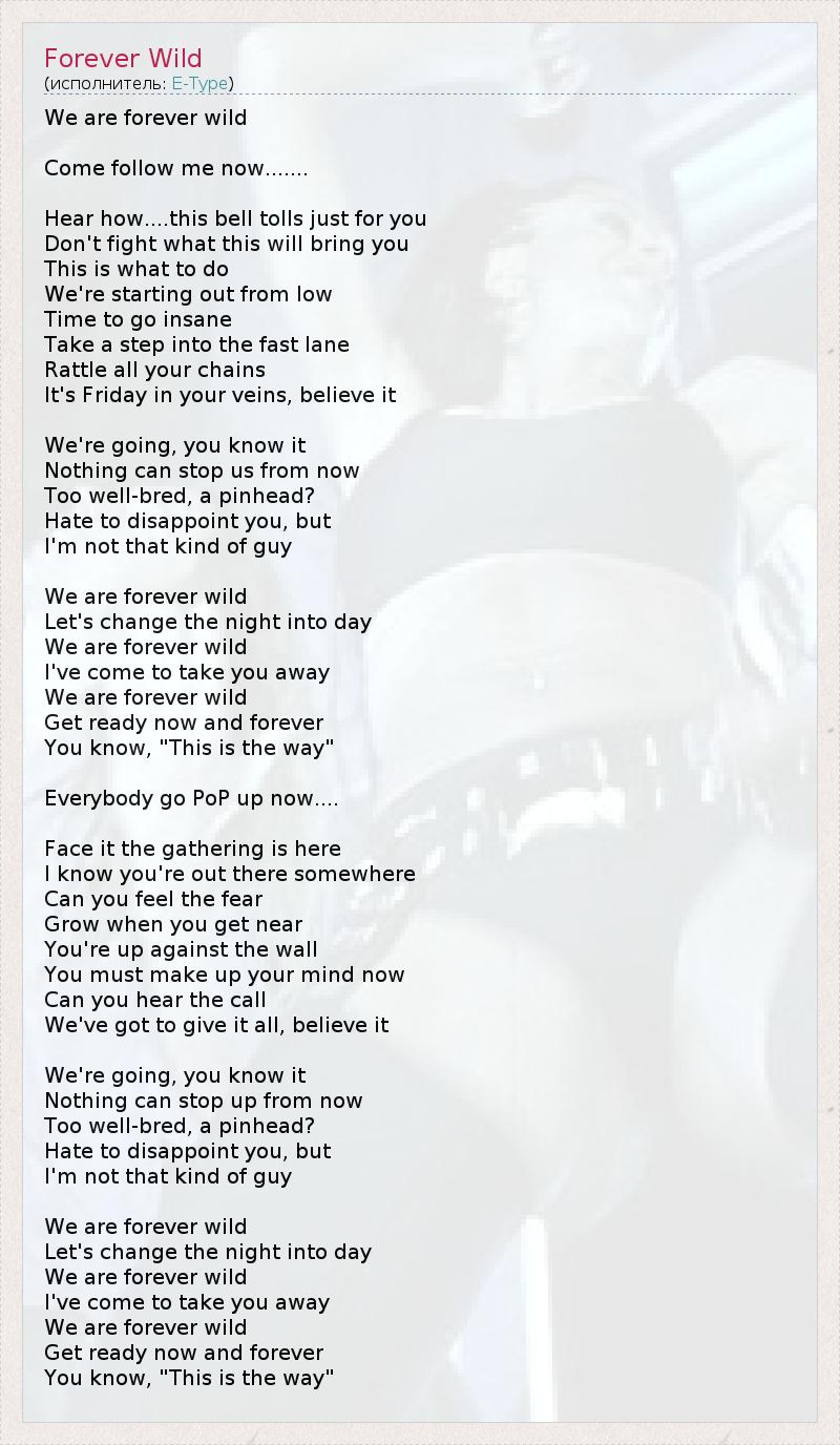 We are forever wild Come follow me now....... Hear how....this bell tolls just for you Don't fight what this will bring you This is what to do We're starting out from low Time to go insane Take a step into the fast lane Rattle all your chains It's Friday in your veins, believe it We're going, you know it Nothing can stop us from now Too well-bred, a pinhead? Hate to disappoint you, but I'm not that kind of guy We are forever wild Let's change the night into day We are forever wild I've come to take you away We are forever wild Get ready now and forever You know, "This is the way" Everybody go PoP up now.... Face it the gathering is here I know you're out there somewhere Can you feel the fear Grow when you get near You're up against the wall You must make up your mind now Can you hear the call We've got to give it all, believe it We're going, you know it Nothing can stop up from now Too well-bred, a pinhead? Hate to disappoint you, but I'm not that kind of guy We are forever wild Let's change the night into day We are forever wild I've come to take you away We are forever wild Get ready now and forever You know, "This is the way"