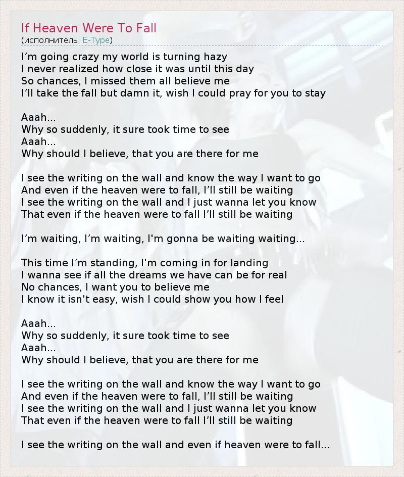 I’m going crazy my world is turning hazy I never realized how close it was until this day So chances, I missed them all believe me I’ll take the fall but damn it, wish I could pray for you to stay Aaah... Why so suddenly, it sure took time to see Aaah... Why should I believe, that you are there for me I see the writing on the wall and know the way I want to go And even if the heaven were to fall, I’ll still be waiting I see the writing on the wall and I just wanna let you know That even if the heaven were to fall I’ll still be waiting I’m waiting, I’m waiting, I'm gonna be waiting waiting... This time I’m standing, I'm coming in for landing I wanna see if all the dreams we have can be for real No chances, I want you to believe me I know it isn't easy, wish I could show you how I feel Aaah... Why so suddenly, it sure took time to see Aaah... Why should I believe, that you are there for me I see the writing on the wall and know the way I want to go And even if the heaven were to fall, I’ll still be waiting I see the writing on the wall and I just wanna let you know That even if the heaven were to fall I’ll still be waiting I see the writing on the wall and even if heaven were to fall...