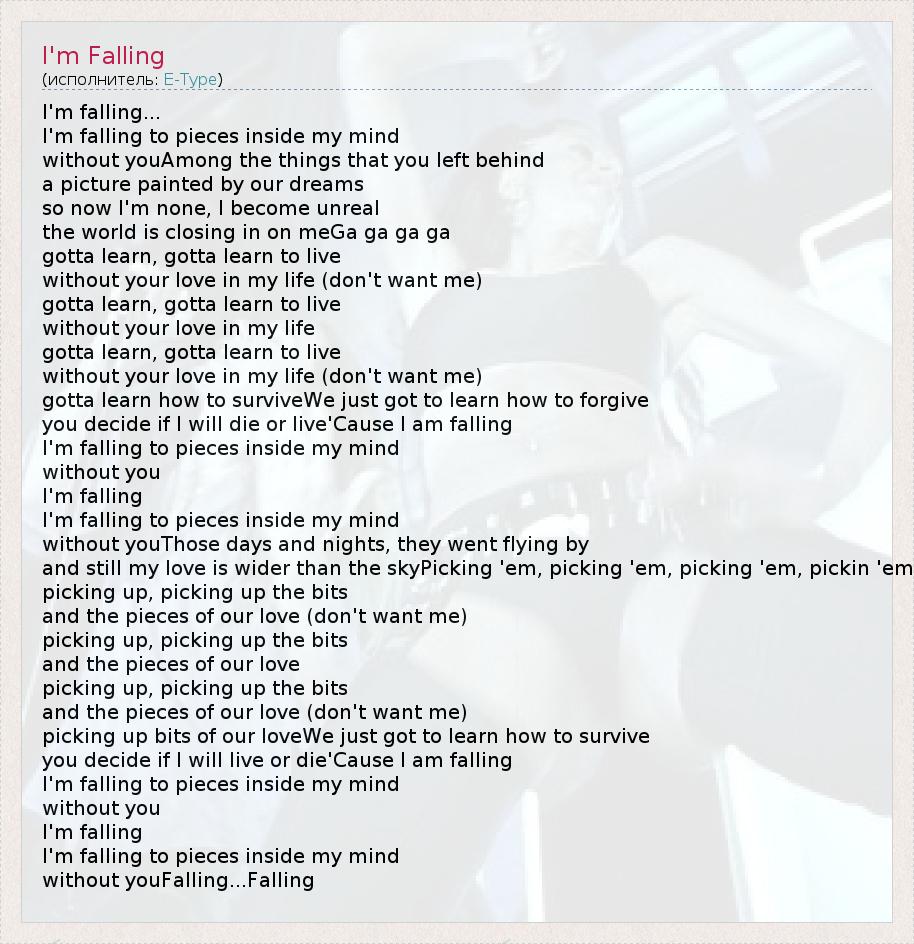 I'm falling... I'm falling to pieces inside my mind without youAmong the things that you left behind a picture painted by our dreams so now I'm none, I become unreal the world is closing in on meGa ga ga ga gotta learn, gotta learn to live without your love in my life (don't want me) gotta learn, gotta learn to live without your love in my life gotta learn, gotta learn to live without your love in my life (don't want me) gotta learn how to surviveWe just got to learn how to forgive you decide if I will die or live'Cause I am falling I'm falling to pieces inside my mind without you I'm falling I'm falling to pieces inside my mind without youThose days and nights, they went flying by and still my love is wider than the skyPicking 'em, picking 'em, picking 'em, pickin 'em picking up, picking up the bits and the pieces of our love (don't want me) picking up, picking up the bits and the pieces of our love picking up, picking up the bits and the pieces of our love (don't want me) picking up bits of our loveWe just got to learn how to survive you decide if I will live or die'Cause I am falling I'm falling to pieces inside my mind without you I'm falling I'm falling to pieces inside my mind without youFalling...Falling