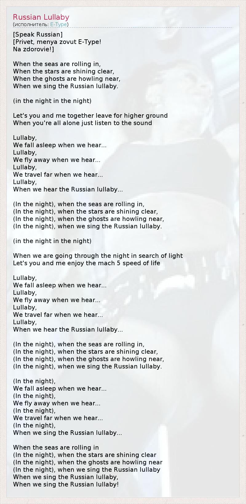 [Говорит по-русски] [Привет, меня зовут E-Type. На здоровье!] Когда волнуются моря... Когда ярко сияют звезды... Когда призраки завывают совсем близко... Когда мы поем русскую колыбельную... (по ночам, по ночам) Давай мы с тобой перенесемся в высший мир. Когда тебе одиноко, просто прислушайся к этому звучанию. Колыбельная, Мы засыпаем, когда слышим Колыбельную, Мы улетаем, когда слышим Колыбельную, Нас уносит, когда мы слышим Колыбельную. Когда мы слышим русскую колыбельную. По ночам, когда волнуются моря, По ночам, когда ярко сияют звезды, По ночам, когда призраки завывают совсем близко, По ночам, когда поется русская колыбельная. (по ночам, по ночам) Когда мы бродим в ночи в поисках света, Давай насладимся с тобой запредельной скоростью жизни*. Колыбельная, Мы засыпаем, когда слышим Колыбельную, Мы улетаем, когда слышим Колыбельную, Нас уносит, когда мы слышим Колыбельную. Когда мы слышим русскую колыбельную. По ночам, когда волнуются моря, По ночам, когда ярко сияют звезды, По ночам, когда призраки завывают совсем близко, По ночам, когда поется русская колыбельная. (По ночам) Мы засыпаем, когда слышим... (По ночам) Мы улетаем, когда слышим... (По ночам) Нас уносит, когда мы слышим (По ночам) Когда мы поем русскую колыбельную! Когда волнуются моря, По ночам, когда ярко сияют звезды, По ночам, когда призраки завывают совсем близко, По ночам, когда поется русская колыбельная, Когда поется русская колыбельная, Когда поется русская колыбельная! *досл. "жизнью, со скоростью Mach Five". Mach Five – название сверхзвуковой гоночной машины главного героя аниме "Гонщик" (оригинальное японское название "Mach Go Go Go"), вышедшего в 1967 г.
