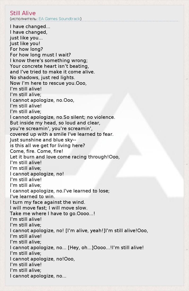 I have changed... I have changed, just like you... Just like you! For how long? For how long must I wait? I know there's something wrong; Your concrete heart isn't beating, and I've tried to make it come alive. No shadows, just red lights. Now I'm here to rescue you.Ooo, I'm still alive! I'm still alive; I cannot apologize, no.Ooo, I'm still alive! I'm still alive; I cannot apologize, no.So silent; no violence. But inside my head, so loud and clear, you're screamin', you're screamin', covered up with a smile I've learned to fear. Just sunshine and blue sky-- is this all we get for living here? Come, fire. Come, fire! Let it burn and love come racing through!Ooo, I'm still alive! I'm still alive; I cannot apologize, no! I'm still alive! I'm still alive; I cannot apologize, no.I've learned to lose; I've learned to win. I turn my face against the wind. I will move fast; I will move slow. Take me where I have to go.Oooo...! I'm still alive! I'm still alive; I cannot apologize, no! [I'm alive, yeah!]I'm still alive!Ooo, I'm still alive! I'm still alive; I cannot apologize, no... [Hey, oh...]Oooo...!I'm still alive! I'm still alive; I cannot apologize, no!Ooo, I'm still alive! I'm still alive; I cannot apologize, no...
