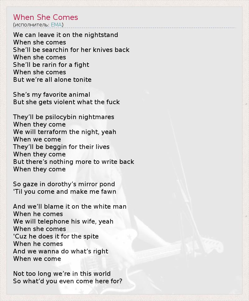 We can leave it on the nightstand When she comes She’ll be searchin for her knives back When she comes She’ll be rarin for a fight When she comes But we’re all alone tonite She’s my favorite animal But she gets violent what the fuck They’ll be psilocybin nightmares When they come We will terraform the night, yeah When we come They’ll be beggin for their lives When they come But there’s nothing more to write back When they come So gaze in dorothy’s mirror pond 'Til you come and make me fawn And we’ll blame it on the white man When he comes We will telephone his wife, yeah When she comes 'Cuz he does it for the spite When he comes And we wanna do what’s right When we come Not too long we’re in this world So what’d you even come here for?