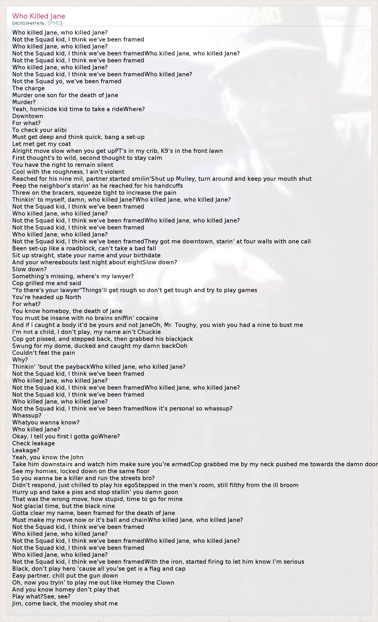 Thinkin' to myself, damn, who killed Jane?Who killed Jane, who killed Jane?