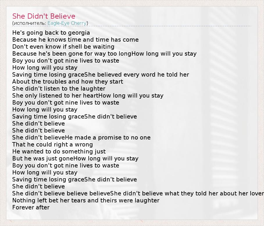 He's going back to georgia Because he knows time and time has come Don't even know if shell be waiting Because he's been gone for way too longHow long will you stay Boy you don't got nine lives to waste How long will you stay Saving time losing graceShe believed every word he told her About the troubles and how they start She didn't listen to the laughter She only listened to her heartHow long will you stay Boy you don't got nine lives to waste How long will you stay Saving time losing graceShe didn't believe She didn't believe She didn't believe She didn't believeHe made a promise to no one That he could right a wrong He wanted to do something just But he was just goneHow long will you stay Boy you don't got nine lives to waste How long will you stay Saving time losing graceShe didn't believe She didn't believe She didn't believe believe believeShe didn't believe what they told her about her lover Nothing left bet her tears and theirs were laughter Forever after