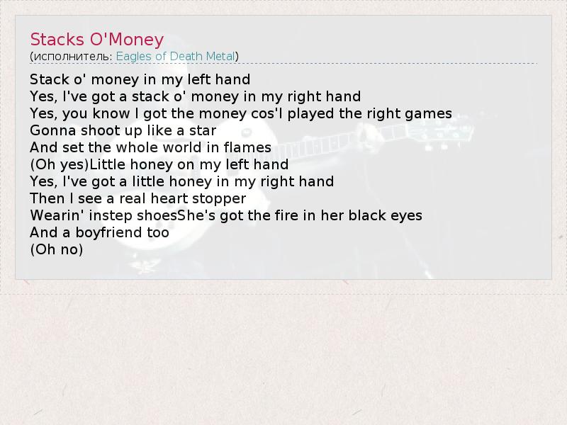 А как ты думаешь, о чем песня "Stacks O'Money" ?