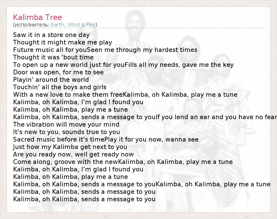 Saw it in a store one day Thought it might make me play Future music all for youSeen me through my hardest times Thought it was 'bout time To open up a new world just for youFills all my needs, gave me the key Door was open, for me to see Playin' around the world Touchin' all the boys and girls With a new love to make them freeKalimba, oh Kalimba, play me a tune Kalimba, oh Kalimba, I'm glad I found you Kalimba, oh Kalimba, play me a tune Kalimba, oh Kalimba, sends a message to youIf you lend an ear and you have no fear The vibration will move your mind It's new to you, sounds true to you Sacred music before it's timePlay it for you now, wanna see Just how my Kalimba get next to you Are you ready now, well get ready now Come along, groove with the newKalimba, oh Kalimba, play me a tune Kalimba, oh Kalimba, I'm glad I found you Kalimba, oh Kalimba, play me a tune Kalimba, oh Kalimba, sends a message to youKalimba, oh Kalimba, play me a tune Kalimba, oh Kalimba, sends a message to you Kalimba, oh Kalimba, sends a message to you