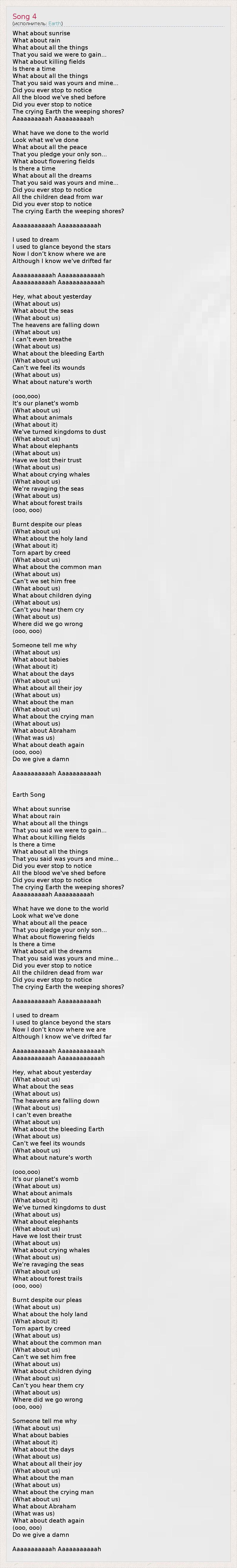 What about sunrise What about rain What about all the things That you said we were to gain... What about killing fields Is there a time What about all the things That you said was yours and mine... Did you ever stop to notice All the blood we've shed before Did you ever stop to notice The crying Earth the weeping shores? Aaaaaaaaaah Aaaaaaaaaah What have we done to the world Look what we've done What about all the peace That you pledge your only son... What about flowering fields Is there a time What about all the dreams That you said was yours and mine... Did you ever stop to notice All the children dead from war Did you ever stop to notice The crying Earth the weeping shores? Aaaaaaaaaaah Aaaaaaaaaaah I used to dream I used to glance beyond the stars Now I don't know where we are Although I know we've drifted far Aaaaaaaaaaah Aaaaaaaaaaaah Aaaaaaaaaaah Aaaaaaaaaaaah Hey, what about yesterday (What about us) What about the seas (What about us) The heavens are falling down (What about us) I can't even breathe (What about us) What about the bleeding Earth (What about us) Can't we feel its wounds (What about us) What about nature's worth (ooo,ooo) It's our planet's womb (What about us) What about animals (What about it) We've turned kingdoms to dust (What about us) What about elephants (What about us) Have we lost their trust (What about us) What about crying whales (What about us) We're ravaging the seas (What about us) What about forest trails (ooo, ooo) Burnt despite our pleas (What about us) What about the holy land (What about it) Torn apart by creed (What about us) What about the common man (What about us) Can't we set him free (What about us) What about children dying (What about us) Can't you hear them cry (What about us) Where did we go wrong (ooo, ooo) Someone tell me why (What about us) What about babies (What about it) What about the days (What about us) What about all their joy (What about us) What about the man (What about us) What about the crying man (What about us) What about Abraham (What was us) What about death again (ooo, ooo) Do we give a damn Aaaaaaaaaaah Aaaaaaaaaaah Earth Song What about sunrise What about rain What about all the things That you said we were to gain... What about killing fields Is there a time What about all the things That you said was yours and mine... Did you ever stop to notice All the blood we've shed before Did you ever stop to notice The crying Earth the weeping shores? Aaaaaaaaaah Aaaaaaaaaah What have we done to the world Look what we've done What about all the peace That you pledge your only son... What about flowering fields Is there a time What about all the dreams That you said was yours and mine... Did you ever stop to notice All the children dead from war Did you ever stop to notice The crying Earth the weeping shores? Aaaaaaaaaaah Aaaaaaaaaaah I used to dream I used to glance beyond the stars Now I don't know where we are Although I know we've drifted far Aaaaaaaaaaah Aaaaaaaaaaaah Aaaaaaaaaaah Aaaaaaaaaaaah Hey, what about yesterday (What about us) What about the seas (What about us) The heavens are falling down (What about us) I can't even breathe (What about us) What about the bleeding Earth (What about us) Can't we feel its wounds (What about us) What about nature's worth (ooo,ooo) It's our planet's womb (What about us) What about animals (What about it) We've turned kingdoms to dust (What about us) What about elephants (What about us) Have we lost their trust (What about us) What about crying whales (What about us) We're ravaging the seas (What about us) What about forest trails (ooo, ooo) Burnt despite our pleas (What about us) What about the holy land (What about it) Torn apart by creed (What about us) What about the common man (What about us) Can't we set him free (What about us) What about children dying (What about us) Can't you hear them cry (What about us) Where did we go wrong (ooo, ooo) Someone tell me why (What about us) What about babies (What about it) What about the days (What about us) What about all their joy (What about us) What about the man (What about us) What about the crying man (What about us) What about Abraham (What was us) What about death again (ooo, ooo) Do we give a damn Aaaaaaaaaaah Aaaaaaaaaaah