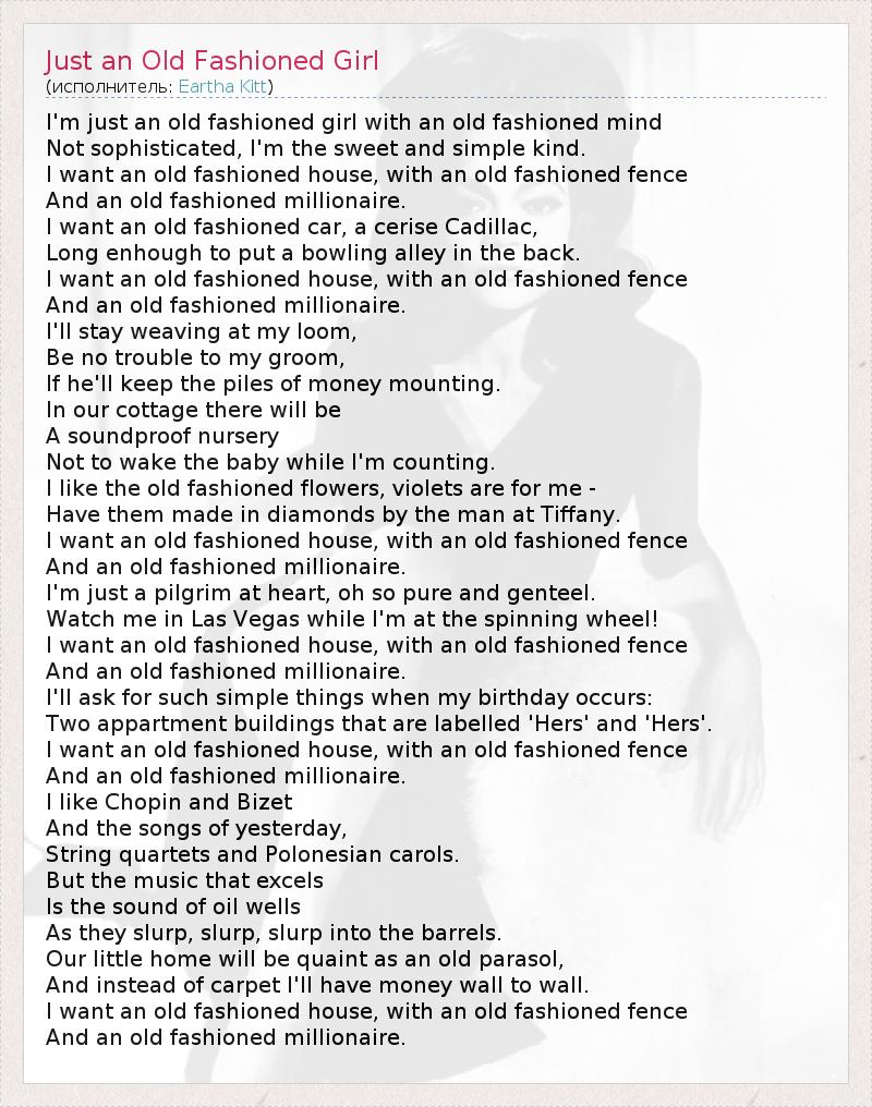 Я просто старомодная девушка с старомодный виду Не сложный, я сладкий и простой вид. Я хочу старомодный дом, с старомодный забор И старомодный миллионером. Я хочу старомодный автомобиль, вишневый Cadillac, Длинные enhough поставить боулинг в спину. Я хочу старомодный дом, с старомодный забор И старомодный миллионером. Я останусь ткачество на мой станок, Будьте никаких проблем с моим женихом, Если он будет держать кучу денег монтажа. В нашем коттедже будет Звукоизоляционные питомник Не разбудить малыша, пока я рассчитываю. Я люблю старомодные цветы, фиалки для меня - Пусть они сделали в алмазах человеком у Тиффани. Я хочу старомодный дом, с старомодный забор И старомодный миллионером. Я просто странник на сердце, о, так чист и благородно. Смотрите мне в Лас-Вегасе, а я в прялкой! Я хочу старомодный дом, с старомодный забор И старомодный миллионером. Я попрошу таких простых вещей, когда происходит мой день рождения: Два Жилые дома, которые помечены "Ее" и "Ее". Я хочу старомодный дом, с старомодный забор И старомодный миллионером. Мне нравится Шопен и Бизе И песни вчера, Струнные квартеты и Polonesian колядки. Но музыка, которая отличается Есть звук нефтяных скважин Как чавкать, чавкать, чавкать в бочки. Наш маленький дом будет причудливый, как старый зонтик, И вместо того, ковер мне придется деньги от стены до стены. Я хочу старомодный дом, с старомодный забор И старомодный миллионером.