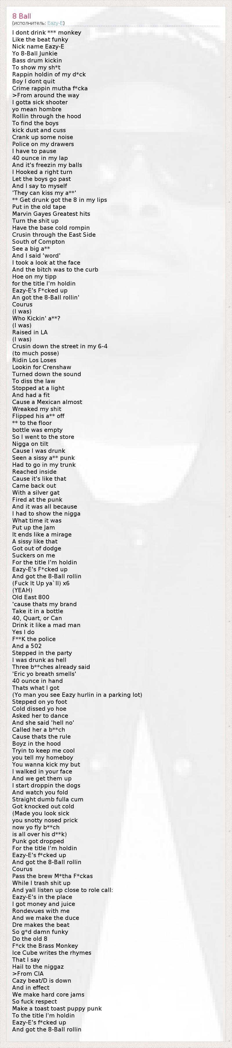 Это интересно:Eazy-Е (7 сентября 1963 года - 26 марта 1995 года) прославился на этой земле как крестный отец гангста-рэпа, создатель одной из самых важных рэпперских групп всех времен. Он имел свой лейбл, был одной из заметных фигур в республиканской партии США, у него было множество фэнов во всем мире и он был еще и большим игроком по жизни. И как любой игрок, подпитываемый азартом, он свято верил мифу, что ему... продолжение