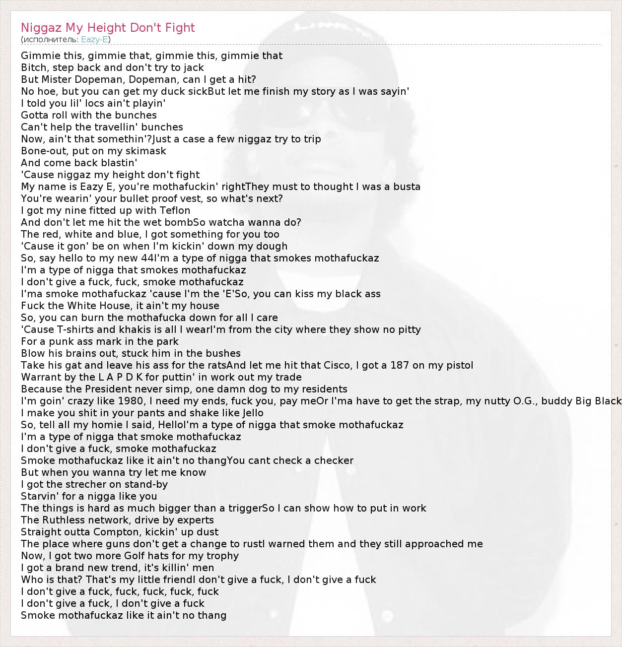 А как ты думаешь, о чем песня "Niggaz My Height Don't Fight" ?