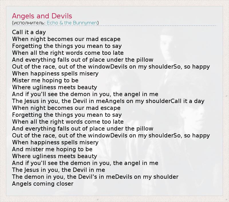 Call it a day When night becomes our mad escape Forgetting the things you mean to say When all the right words come too late And everything falls out of place under the pillow Out of the race, out of the windowDevils on my shoulderSo, so happy When happiness spells misery Mister me hoping to be Where ugliness meets beauty And if you'll see the demon in you, the angel in me The Jesus in you, the Devil in meAngels on my shoulderCall it a day When night becomes our mad escape Forgetting the things you mean to say When all the right words come too late And everything falls out of place under the pillow Out of the race, out of the windowDevils on my shoulderSo, so happy When happiness spells misery And mister me hoping to be Where ugliness meets beauty And if you'll see the demon in you, the angel in me The Jesus in you, the Devil in me The demon in you, the Devil's in meDevils on my shoulder Angels coming closer