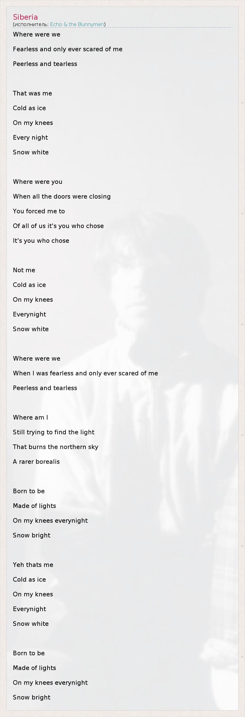 Where were we Fearless and only ever scared of me Peerless and tearless That was me Cold as ice On my knees Every night Snow white Where were you When all the doors were closing You forced me to Of all of us it's you who chose It's you who chose Not me Cold as ice On my knees Everynight Snow white Where were we When I was fearless and only ever scared of me Peerless and tearless Where am I Still trying to find the light That burns the northern sky A rarer borealis Born to be Made of lights On my knees everynight Snow bright Yeh thats me Cold as ice On my knees Everynight Snow white Born to be Made of lights On my knees everynight Snow bright