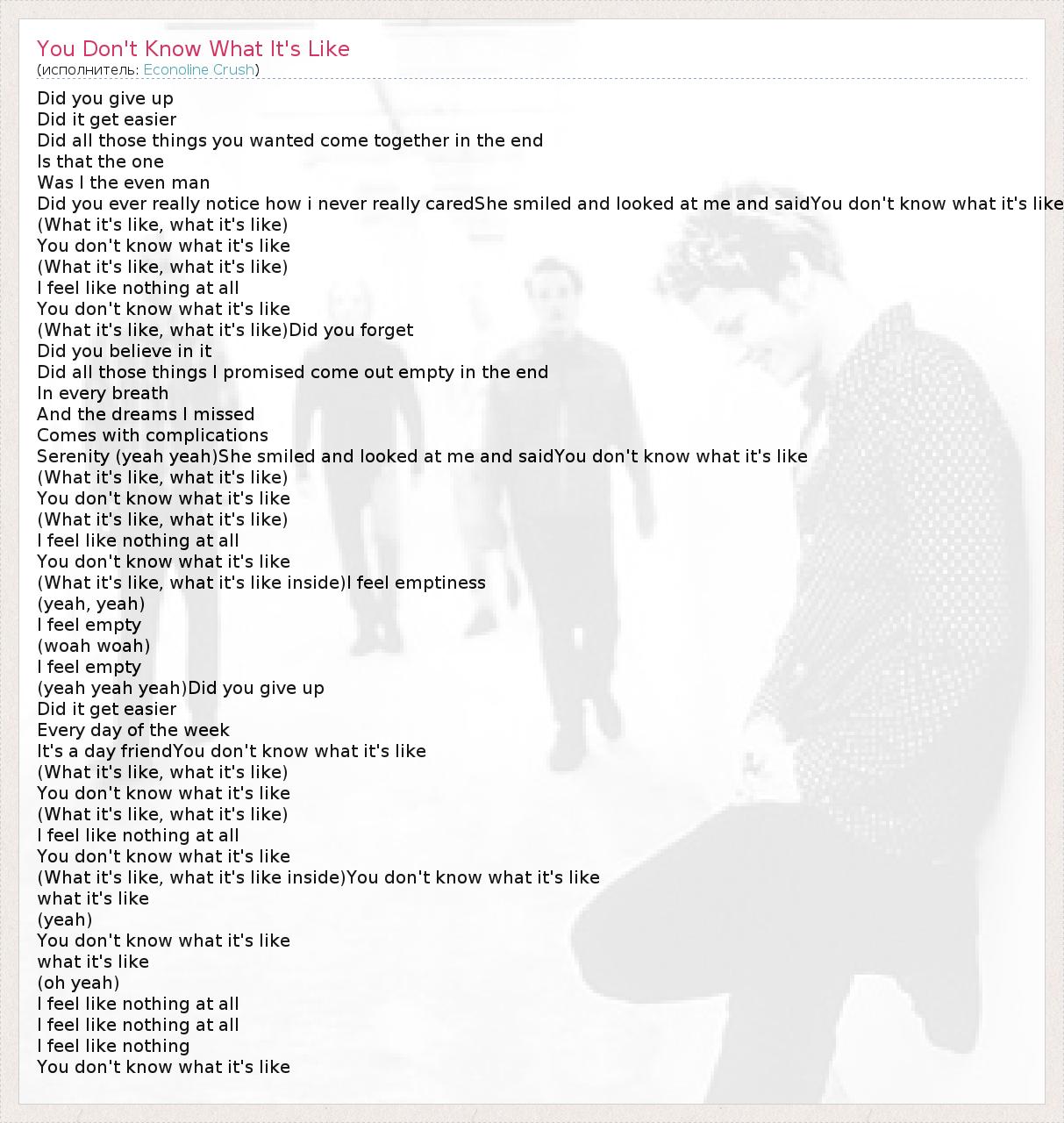 А как ты думаешь, о чем песня "You Don't Know What It's Like" ?
