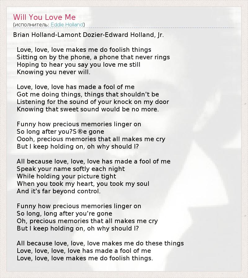 Brian Holland-Lamont Dozier-Edward Holland, Jr. Love, love, love makes me do foolish things Sitting on by the phone, a phone that never rings Hoping to hear you say you love me still Knowing you never will. Love, love, love has made a fool of me Got me doing things, things that shouldn't be Listening for the sound of your knock on my door Knowing that sweet sound would be no more. Funny how precious memories linger on So long after you?S®e gone Oooh, precious memories that all makes me cry But I keep holding on, oh why should I? All because love, love, love has made a fool of me Speak your name softly each night While holding your picture tight When you took my heart, you took my soul And it's far beyond control. Funny how precious memories linger on So long, long after you're gone Oh, precious memories that all makes me cry But I keep holding on, oh why should I? All because love, love, love makes me do these things Love, love, love, love has made a fool of me Love, love, love makes me do foolish things.