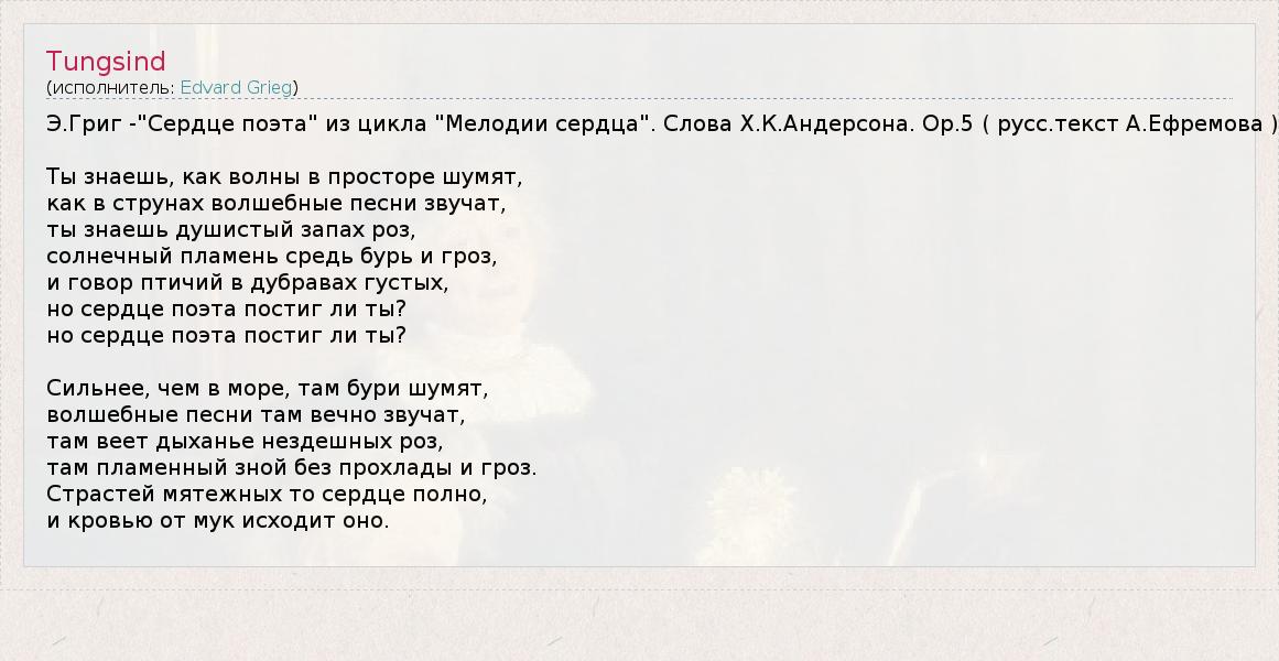Э.Григ -"Сердце поэта" из цикла "Мелодии сердца". Слова Х.К.Андерсона. Op.5 ( русс.текст А.Ефремова )