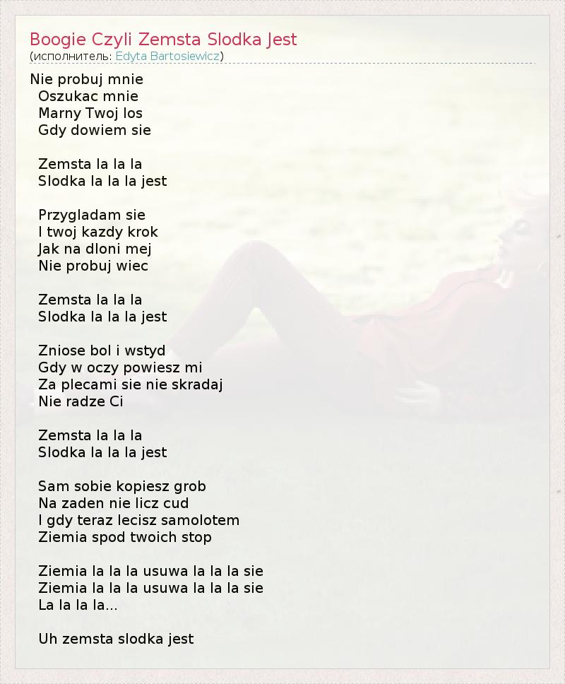 Nie probuj mnie Oszukac mnie Marny Twoj los Gdy dowiem sie Zemsta la la la Slodka la la la jest Przygladam sie I twoj kazdy krok Jak na dloni mej Nie probuj wiec Zemsta la la la Slodka la la la jest Zniose bol i wstyd Gdy w oczy powiesz mi Za plecami sie nie skradaj Nie radze Ci Zemsta la la la Slodka la la la jest Sam sobie kopiesz grob Na zaden nie licz cud I gdy teraz lecisz samolotem Ziemia spod twoich stop Ziemia la la la usuwa la la la sie Ziemia la la la usuwa la la la sie La la la la... Uh zemsta slodka jest