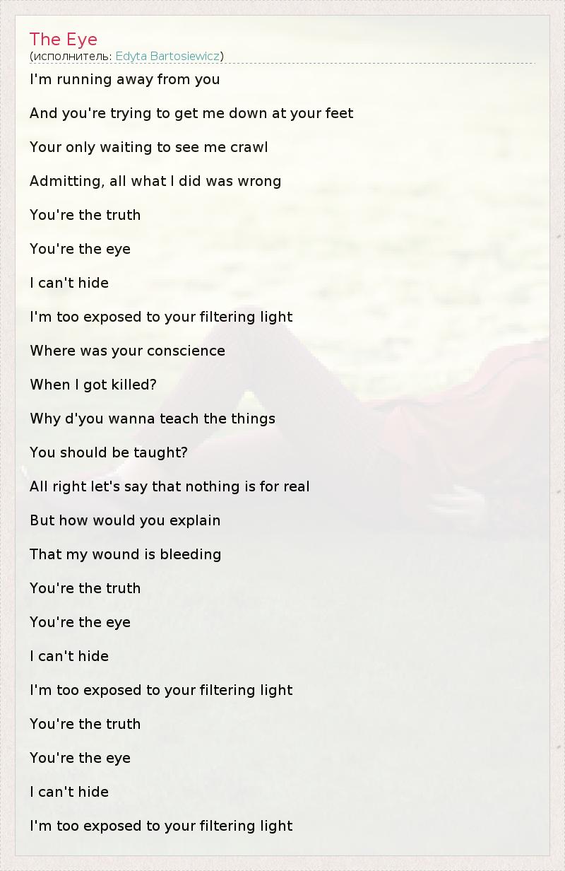 I'm running away from you And you're trying to get me down at your feet Your only waiting to see me crawl Admitting, all what I did was wrong You're the truth You're the eye I can't hide I'm too exposed to your filtering light Where was your conscience When I got killed? Why d'you wanna teach the things You should be taught? All right let's say that nothing is for real But how would you explain That my wound is bleeding You're the truth You're the eye I can't hide I'm too exposed to your filtering light You're the truth You're the eye I can't hide I'm too exposed to your filtering light