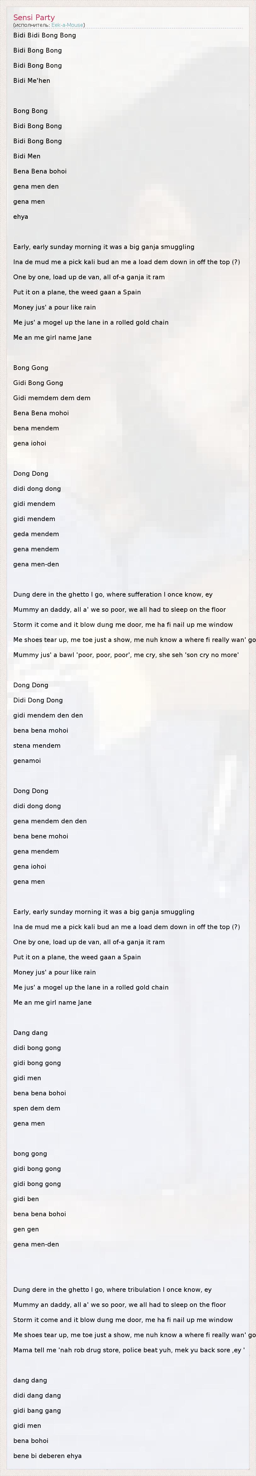 Bidi Bidi Bong Bong Bidi Bong Bong Bidi Bong Bong Bidi Me'hen Bong Bong Bidi Bong Bong Bidi Bong Bong Bidi Men Bena Bena bohoi gena men den gena men ehya Early, early sunday morning it was a big ganja smuggling Ina de mud me a pick kali bud an me a load dem down in off the top (?) One by one, load up de van, all of-a ganja it ram Put it on a plane, the weed gaan a Spain Money jus' a pour like rain Me jus' a mogel up the lane in a rolled gold chain Me an me girl name Jane Bong Gong Gidi Bong Gong Gidi memdem dem dem Bena Bena mohoi bena mendem gena iohoi Dong Dong didi dong dong gidi mendem gidi mendem geda mendem gena mendem gena men-den Dung dere in the ghetto I go, where sufferation I once know, ey Mummy an daddy, all a' we so poor, we all had to sleep on the floor Storm it come and it blow dung me door, me ha fi nail up me window Me shoes tear up, me toe just a show, me nuh know a where fi really wan' go Mummy jus' a bawl 'poor, poor, poor', me cry, she seh 'son cry no more' Dong Dong Didi Dong Dong gidi mendem den den bena bena mohoi stena mendem genamoi Dong Dong didi dong dong gena mendem den den bena bene mohoi gena mendem gena iohoi gena men Early, early sunday morning it was a big ganja smuggling Ina de mud me a pick kali bud an me a load dem down in off the top (?) One by one, load up de van, all of-a ganja it ram Put it on a plane, the weed gaan a Spain Money jus' a pour like rain Me jus' a mogel up the lane in a rolled gold chain Me an me girl name Jane Dang dang didi bong gong gidi bong gong gidi men bena bena bohoi spen dem dem gena men bong gong gidi bong gong gidi bong gong gidi ben bena bena bohoi gen gen gena men-den Dung dere in the ghetto I go, where tribulation I once know, ey Mummy an daddy, all a' we so poor, we all had to sleep on the floor Storm it come and it blow dung me door, me ha fi nail up me window Me shoes tear up, me toe just a show, me nuh know a where fi really wan' go Mama tell me 'nah rob drug store, police beat yuh, mek yu back sore ,ey ' dang dang didi dang dang gidi bang gang gidi men bena bohoi bene bi deberen ehya