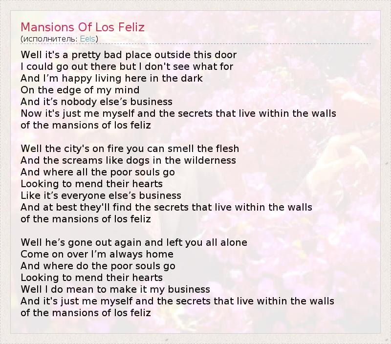 Well it's a pretty bad place outside this door I could go out there but I don't see what for And I’m happy living here in the dark On the edge of my mind And it’s nobody else’s business Now it's just me myself and the secrets that live within the walls of the mansions of los feliz Well the city's on fire you can smell the flesh And the screams like dogs in the wilderness And where all the poor souls go Looking to mend their hearts Like it’s everyone else’s business And at best they'll find the secrets that live within the walls of the mansions of los feliz Well he’s gone out again and left you all alone Come on over I’m always home And where do the poor souls go Looking to mend their hearts Well I do mean to make it my business And it's just me myself and the secrets that live within the walls of the mansions of los feliz