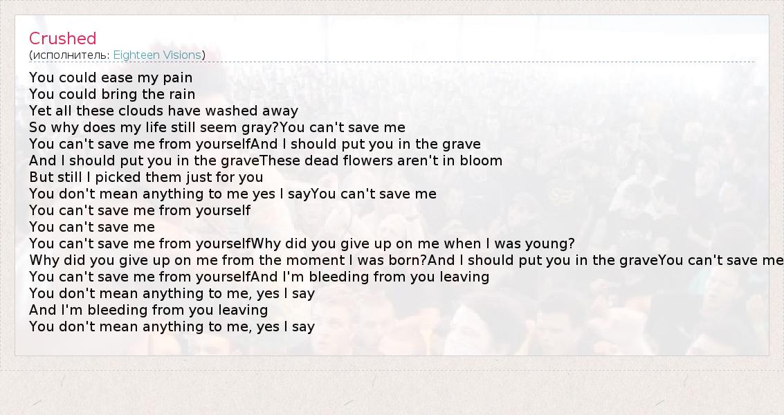 Это интересно:Eighteen Visions - metalcore \ alternative metal группа была сформирована в октябре 1995 года, в Ориндже, штат Калифорния, США, по инициативе James Hart, Dave Peters, Billy Sisler и Ken Floyd. Уже в следующем году, имея в своем архиве некий материал собственного сочинения, группа приступила к концертной деятельности в калифорнийских окрестностях. Первый стабильный состав «Eighteen Visions»... продолжение