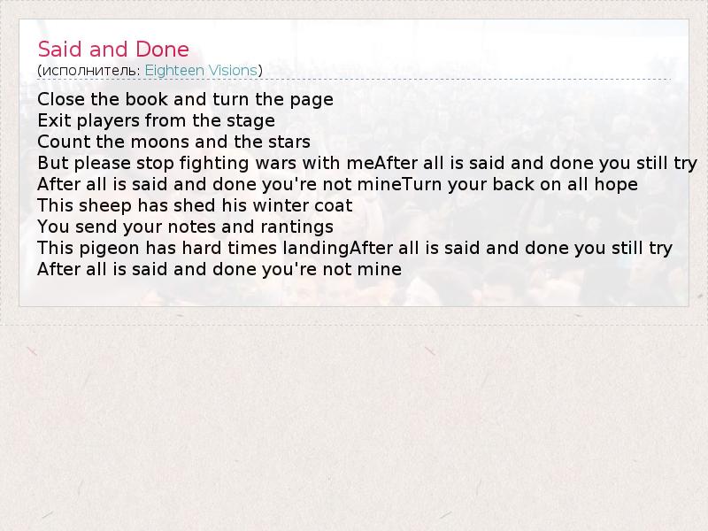 Это интересно:Eighteen Visions - metalcore \ alternative metal группа была сформирована в октябре 1995 года, в Ориндже, штат Калифорния, США, по инициативе James Hart, Dave Peters, Billy Sisler и Ken Floyd. Уже в следующем году, имея в своем архиве некий материал собственного сочинения, группа приступила к концертной деятельности в калифорнийских окрестностях. Первый стабильный состав «Eighteen Visions»... продолжение