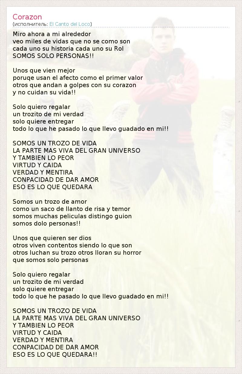 Miro ahora a mi alrededor veo miles de vidas que no se como son cada uno su historia cada uno su Rol SOMOS SOLO PERSONAS!! Unos que vien mejor poruqe usan el afecto como el primer valor otros que andan a golpes con su corazon y no cuidan su vida!! Solo quiero regalar un trozito de mi verdad solo quiere entregar todo lo que he pasado lo que llevo guadado en mi!! SOMOS UN TROZO DE VIDA LA PARTE MAS VIVA DEL GRAN UNIVERSO Y TAMBIEN LO PEOR VIRTUD Y CAIDA VERDAD Y MENTIRA CONPACIDAD DE DAR AMOR ESO ES LO QUE QUEDARA Somos un trozo de amor como un saco de llanto de risa y temor somos muchas peliculas distingo guion somos dolo personas!! Unos que quieren ser dios otros viven contentos siendo lo que son otros luchan su trozo otros lloran su horror que somos solo personas Solo quiero regalar un trozito de mi verdad solo quiere entregar todo lo que he pasado lo que llevo guadado en mi!! SOMOS UN TROZO DE VIDA LA PARTE MAS VIVA DEL GRAN UNIVERSO Y TAMBIEN LO PEOR VIRTUD Y CAIDA VERDAD Y MENTIRA CONPACIDAD DE DAR AMOR ESO ES LO QUE QUEDARA!!