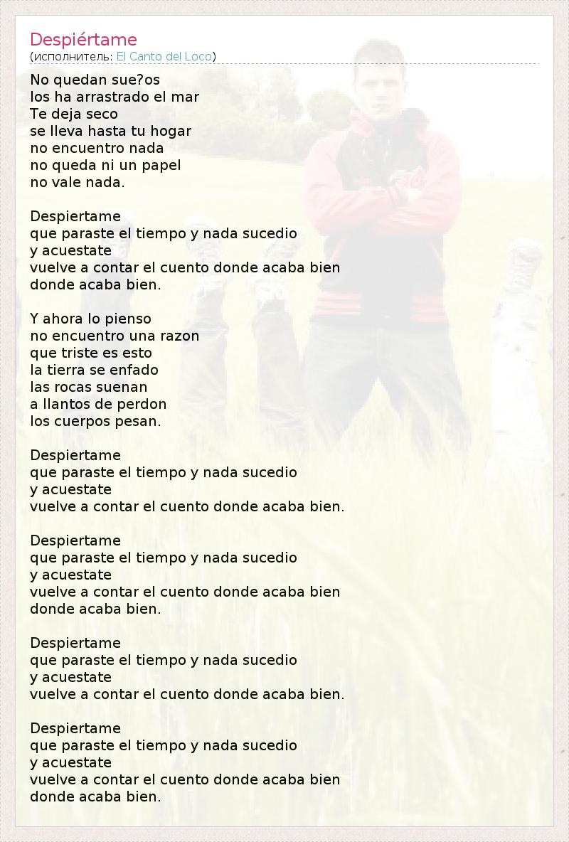 No quedan sue?os los ha arrastrado el mar Te deja seco se lleva hasta tu hogar no encuentro nada no queda ni un papel no vale nada. Despiertame que paraste el tiempo y nada sucedio y acuestate vuelve a contar el cuento donde acaba bien donde acaba bien. Y ahora lo pienso no encuentro una razon que triste es esto la tierra se enfado las rocas suenan a llantos de perdon los cuerpos pesan. Despiertame que paraste el tiempo y nada sucedio y acuestate vuelve a contar el cuento donde acaba bien. Despiertame que paraste el tiempo y nada sucedio y acuestate vuelve a contar el cuento donde acaba bien donde acaba bien. Despiertame que paraste el tiempo y nada sucedio y acuestate vuelve a contar el cuento donde acaba bien. Despiertame que paraste el tiempo y nada sucedio y acuestate vuelve a contar el cuento donde acaba bien donde acaba bien.