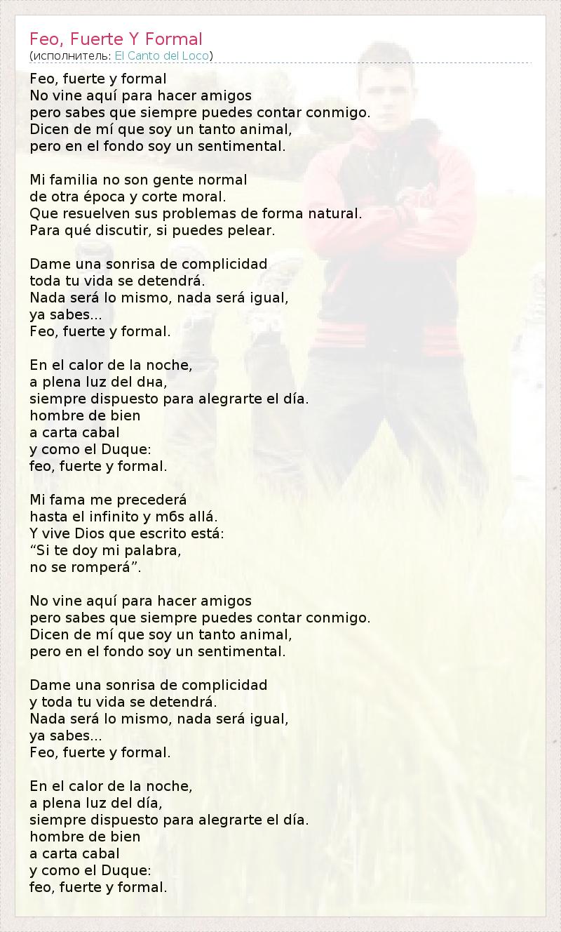 Фео , Фуэрте у формального Нет лоза aquí пункт Hacer Amigos перо sabes дие Siempre puedes CONTAR Conmigo . Dicen де mí дие соевый ООН Танто животных , перо ан -эль Fondo соевый ООН сентиментальным. Ми Familia нет сына Gente нормально де Otra EPOCA у Корте моральная . Que resuelven устой Problemas де Forma естественно. Пара qué discutir , си puedes pelear . Дам уна Sonrisa де complicidad Тода ту Vida себе detendrá . Нада Sera вот Mismo , нада Sera Igual , я sabes ... Фео , Фуэрте у формальным. En -эль Детектор жидких де ла Noche , Plena Лус дель dнa , Siempre dispuesto пункт alegrarte эль Dia . Hombre -де- Бьен Carta клика у Комо El Duque : FeO , Фуэрте у формальным. Ми Fama меня precederá хаста эль Infinito у mбs Алла . У Vive Диос дие Секретер está : " Si те дой миль Palabra , нет таковой romperá " . Нет лоза aquí пункт Hacer Amigos перо sabes дие Siempre puedes CONTAR Conmigo . Dicen де mí дие соевый ООН Танто животных , перо ан -эль Fondo соевый ООН сентиментальным. Дам уна Sonrisa де complicidad у Тода ту Vida себе detendrá . Нада Sera вот Mismo , нада Sera Igual , я sabes ... Фео , Фуэрте у формальным. En -эль Детектор жидких де ла Noche , Plena Лус дель диа , Siempre dispuesto пункт alegrarte эль Dia . Hombre -де- Бьен Carta клика у Комо El Duque : FeO , Фуэрте у формальным.
