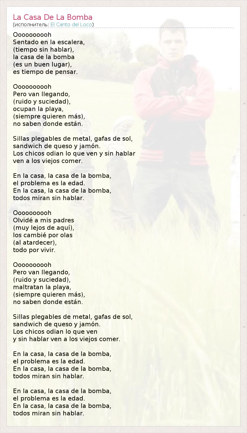 Oooooooooh Sentado en la escalera, (tiempo sin hablar), la casa de la bomba (es un buen lugar), es tiempo de pensar. Oooooooooh Pero van llegando, (ruido y suciedad), ocupan la playa, (siempre quieren más), no saben donde están. Sillas plegables de metal, gafas de sol, sandwich de queso y jamón. Los chicos odian lo que ven y sin hablar ven a los viejos comer. En la casa, la casa de la bomba, el problema es la edad. En la casa, la casa de la bomba, todos miran sin hablar. Oooooooooh Olvidé a mis padres (muy lejos de aquí), los cambié por olas (al atardecer), todo por vivir. Oooooooooh Pero van llegando, (ruido y suciedad), maltratan la playa, (siempre quieren más), no saben donde están. Sillas plegables de metal, gafas de sol, sandwich de queso y jamón. Los chicos odian lo que ven y sin hablar ven a los viejos comer. En la casa, la casa de la bomba, el problema es la edad. En la casa, la casa de la bomba, todos miran sin hablar. En la casa, la casa de la bomba, el problema es la edad. En la casa, la casa de la bomba, todos miran sin hablar.