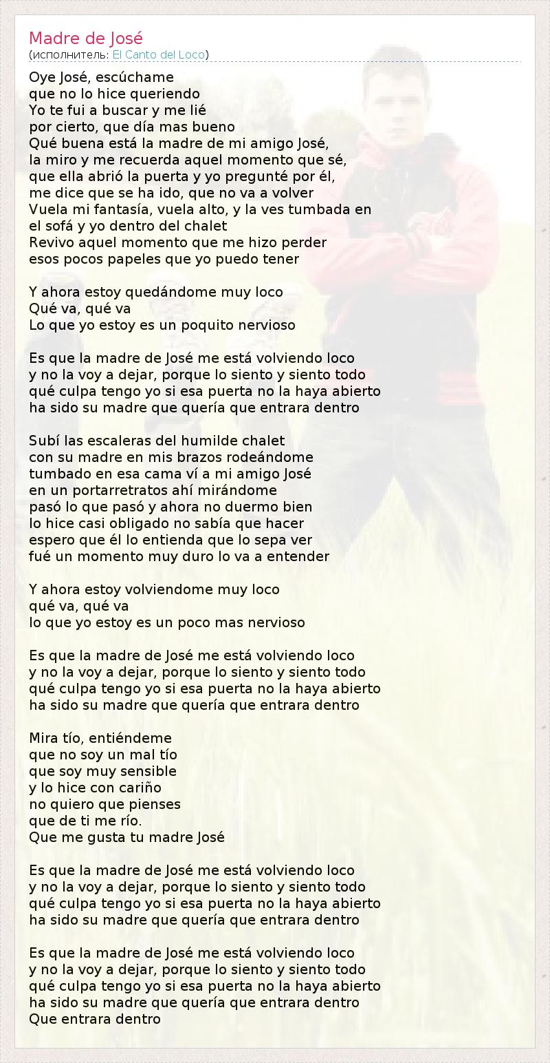 Oye José, escúchame que no lo hice queriendo Yo te fui a buscar y me lié por cierto, que día mas bueno Qué buena está la madre de mi amigo José, la miro y me recuerda aquel momento que sé, que ella abrió la puerta y yo pregunté por él, me dice que se ha ido, que no va a volver Vuela mi fantasía, vuela alto, y la ves tumbada en el sofá y yo dentro del chalet Revivo aquel momento que me hizo perder esos pocos papeles que yo puedo tener Y ahora estoy quedándome muy loco Qué va, qué va Lo que yo estoy es un poquito nervioso Es que la madre de José me está volviendo loco y no la voy a dejar, porque lo siento y siento todo qué culpa tengo yo si esa puerta no la haya abierto ha sido su madre que quería que entrara dentro Subí las escaleras del humilde chalet con su madre en mis brazos rodeándome tumbado en esa cama ví a mi amigo José en un portarretratos ahí mirándome pasó lo que pasó y ahora no duermo bien lo hice casi obligado no sabía que hacer espero que él lo entienda que lo sepa ver fué un momento muy duro lo va a entender Y ahora estoy volviendome muy loco qué va, qué va lo que yo estoy es un poco mas nervioso Es que la madre de José me está volviendo loco y no la voy a dejar, porque lo siento y siento todo qué culpa tengo yo si esa puerta no la haya abierto ha sido su madre que quería que entrara dentro Mira tío, entiéndeme que no soy un mal tío que soy muy sensible y lo hice con cariño no quiero que pienses que de ti me río. Que me gusta tu madre José Es que la madre de José me está volviendo loco y no la voy a dejar, porque lo siento y siento todo qué culpa tengo yo si esa puerta no la haya abierto ha sido su madre que quería que entrara dentro Es que la madre de José me está volviendo loco y no la voy a dejar, porque lo siento y siento todo qué culpa tengo yo si esa puerta no la haya abierto ha sido su madre que quería que entrara dentro Que entrara dentro