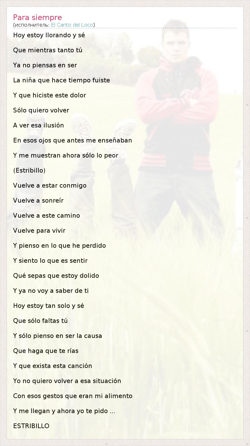 Это интересно:Поп/Рок группа из Мадрида, El Canto del Loco была основана двумя студентами, изучавшими актерское мастерство и интересовавшимися испанским пауэр-попом - Daniel Martín García (aka Dani Martín) и Iván Alejandro Ganchegui, к которым вскоре присоединился гитарист David Otero, ударник Alejandro Velázquez Insua (Jandro) и басист José María Ruiz Casares (Chema Ruiz). После демо-записи и работы с лейблом BMG-Ariola, El Canto del Loco записали одноименный альбом, спродюсированный... продолжение