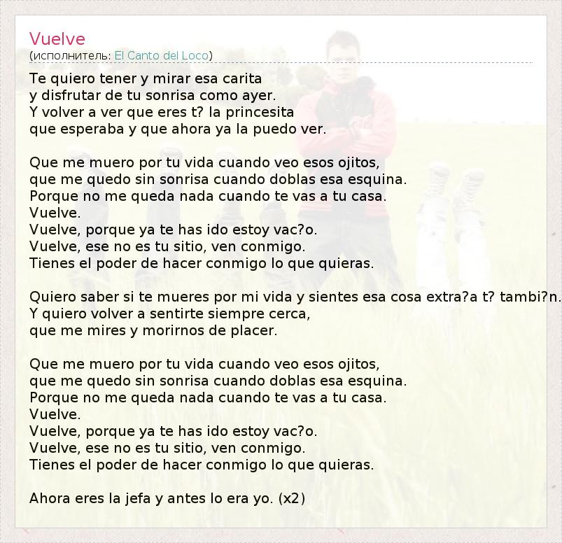 Это интересно:Поп/Рок группа из Мадрида, El Canto del Loco была основана двумя студентами, изучавшими актерское мастерство и интересовавшимися испанским пауэр-попом - Daniel Martín García (aka Dani Martín) и Iván Alejandro Ganchegui, к которым вскоре присоединился гитарист David Otero, ударник Alejandro Velázquez Insua (Jandro) и басист José María Ruiz Casares (Chema Ruiz). После демо-записи и работы с лейблом BMG-Ariola, El Canto del Loco записали одноименный альбом, спродюсированный... продолжение