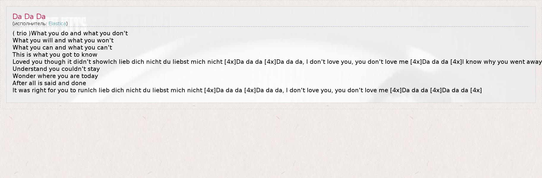 Loved you though it didn't showIch lieb dich nicht du liebst mich nicht [4x]Da da da [4x]Da da da, I don't love you, you don't love me [4x]Da da da [4x]I know why you went away
