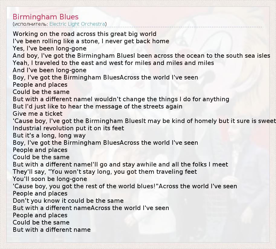 Working on the road across this great big world I've been rolling like a stone, I never get back home Yes, I've been long-gone And boy, I've got the Birmingham BluesI been across the ocean to the south sea isles Yeah, I traveled to the east and west for miles and miles and miles And I've been long-gone Boy, I've got the Birmingham BluesAcross the world I've seen People and places Could be the same But with a different nameI wouldn't change the things I do for anything But I'd just like to hear the message of the streets again Give me a ticket 'Cause boy, I've got the Birmingham BluesIt may be kind of homely but it sure is sweet Industrial revolution put it on its feet But it's a long, long way Boy, I've got the Birmingham BluesAcross the world I've seen People and places Could be the same But with a different nameI'll go and stay awhile and all the folks I meet They'll say, "You won't stay long, you got them traveling feet You'll soon be long-gone 'Cause boy, you got the rest of the world blues!"Across the world I've seen People and places Don't you know it could be the same But with a different nameAcross the world I've seen People and places Could be the same But with a different name